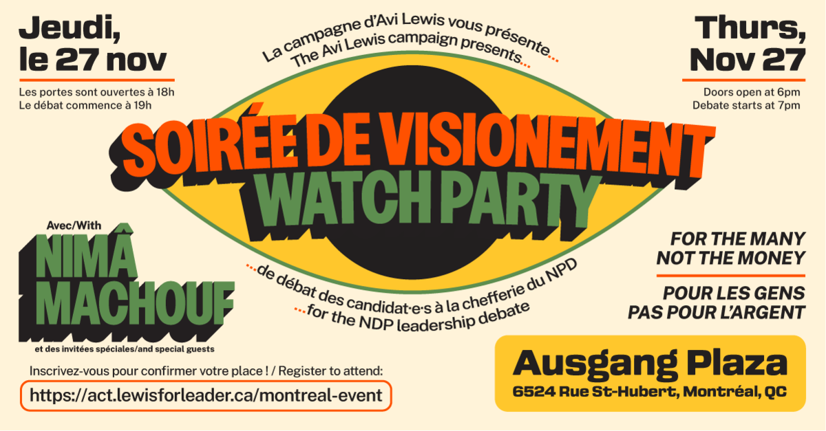 Montreal, it’s time for a new vision in federal politics. Join our candidate Avi, friends and neighbours for a city-wide NDP leadership watch party and a conversation about our future!